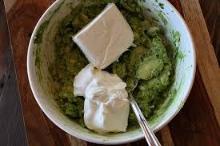 | Guacamole With Sour Cream Recipe by chef.jackson | ifood.tv hot sauce, pepper, avocado, onion, tomato, salt, mayonnaise, lemon juice, sour cream MAKING 1) Cut the avocados into half. 2) Discard the stones i.e. the seeds. 3) Next, scoop out the avocado flesh. 4) Mash the flesh with the rest of the ingredients. SERVING 5) Serve the guacamo...