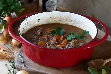 | Irish Beef Stew with Guinness Stout Recipe | CDKitchen.com beef stewing meat, beef stock, olive oil, thyme, rosemary, pepper, parsley, bay leaf, carrot, onion, garlic, salt, fat, stout, flour, meat Beef stew meat is slowly cooked in the oven along with carrots, onion, garlic, beef stock, and Guinness. Preheat the oven to 275 degrees F. Heat a 6-quart oven-proof pan over medium-high heat. Add the...