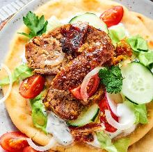 | Alton Brown's Gyro Meat Recipe Recipe - Greek.Food.com ground lamb, pitta bread, olive oil, rosemary, pepper, mint, marjoram, onion, garlic, cucumber, red wine vinegar, salt, yogurt (plain) This is a good version of gyro meat. I like to mix in a little ground beef with the lamb. Cooking times are approximate and include resting times. There are a lot of steps but it is easier than it loo...