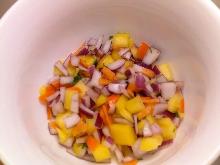 | Habanero Mango Salsa Recipe | CDKitchen.com red onion, coriander, chili pepper, cumin, mango, lime, salt Mangos and habanero peppers combine to provide a sweet heat to this salsa. Try this tropical salsa on fish tacos or simply eat with chips. Gently toss together all the ingredients until mixed. Store i...
