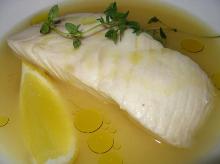 | Poached Halibut with Herbed Vinaigrette Recipe | EatingWell canola oil, thyme, tarragon, pepper, peppercorn, parsley, dill, chives, bay leaf, carrot, shallot, onion, garlic, celery, halibut, mustard, red wine vinegar, salt, lemon juice, sour cream, water Gently simmering mild fish in a simple, fragrant broth--known in French cooking as a court-bouillon--is a wonderful way to impart flavor. Be careful not to overcrowd or overcook the fish, as either wi...