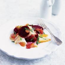 | Smoked halibut, beetroot and clementine salad recipe | delicious. magazine smoked salmon, olive oil, mint, clementine, beetroot, halibut Preheat the oven to 200 C/ fan180 C/gas 6. Scrub the beetroot, rub with the oil and season with salt. Wrap each 1 in foil and pop into a roasting tray, along with about 300ml water. Roast for 50 minut...