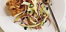 Sauteed Halibut with Shaved Fennel Salad butter, red potato, basil flavored oil, red onion, salad, chicken stock, pepper, potato, shallot, fennel, spinach, halibut, red wine vinegar, salt, white wine If you have the need for speed, fish is the way to go for healthy and satisfying dinners. In this dish, halibut shares a plate with perky, licorice-scented fennel salad. Salad: Using a mandolin or V-s...