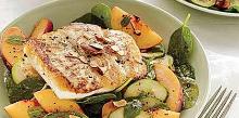 | Halibut & Peach Salad with Lemon-Mint Vinaigrette Recipe | MyRecipes olive oil, almond, pepper, mint, peach, cucumber, spinach, halibut, salt, maple syrup, lemon juice You can substitute another sustainable white fish (such as tilapia or striped bass) for the halibut, and pecans or hazelnuts for the almonds. Instructions Checklist Step 1 Heat a large nonstick skil...
