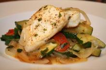 | Emeril's Sauteed Halibut With Zucchini 'pasta' Recipe - Food.com chili dried/powder, lemon peel, seafood stock, olive oil, pine nut, thyme, pepper, parsley, paprika, oregano, cayenne pepper, dried onion, dried garlic, basil, spring onion, garlic, zucchini/courgette, tomato, halibut, salt, parmesan cheese, white wine Perfect for a low carb diet. A great alternative to a pasta dish. Serving Size: 1 (445) g Servings Per Recipe: 4 AMT. PER SERVING % DAILY VALUE Calories: 399 Calories from Fat 183 g 46 % Total Fa...