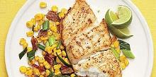 Halibut with Bacony Corn Saute Recipe | MyRecipes butter, olive oil, pepper, lime, spring onion, sweetcorn, halibut, bacon, salt With just a few ingredients, Halibut with Bacony Corn Saute packs in lots of flavor. Be sure to buy fresh, never-frozen fish, summer corn on the cob and in the husks, and your favorite bacon. Applewoo...
