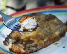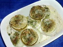 | Halibut Steaks - Maine Style Recipe - Food.com butter, corn flakes, olive oil, mustard powder, dill, dried garlic, halibut, eggs, seasoning, parmesan cheese, milk A superb fish recipe. I have been making this dish for over 30 years. The conmbination of the spices gives the fish a delightful flavor. Serving Size: 1 (266) g Servings Per Recipe: 3 AMT. PER SERVI...
