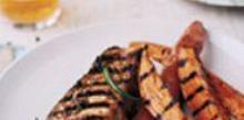 | Jerk Halibut Steaks with Sweet Potato Wedges olive oil, thyme, red peppercorn, ginger root, jalapeno, cayenne pepper, allspice, sweet potato, spring onion, halibut, worcestershire sauce, salt, lime juice Step 1 Lightly grease grill rack. Prepare outdoor grill for covered direct grilling over medium heat. Step 2 Cut each unpeeled sweet potato lengthwise in half. Place sweet potato halves on microwave-...
