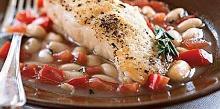 | Halibut With White Beans in Tomato-Rosemary Broth Recipe - Food.com cannellini bean, chicken stock, olive oil, rosemary, pepper, garlic, tomato, halibut, salt, white wine Beans absorb some of the delicious broth. For a special dinner, serve in shallow rimmed bowls and top each serving with a fresh rosemary sprig. Serving Size: 1 (410) g Servings Per Recipe: 4 AMT. P...