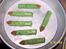 | Bloody Witch Finger Halloween Cookies Recipe | CDKitchen.com butter, almond, vanilla extract, eggs, salt, baking powder, sugar, green food coloring, almond essence, flour A 5-star recipe for Bloody Witch Finger Cookies made with butter, powdered sugar, egg, almond extract, vanilla extract, flour, baking powder, salt In a mixing bowl, beat together butter, sugar, egg, a...