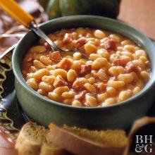 | Baked Beans and Ham Recipe | MyRecipes bean soup, sweet onion, red pepper, oil, ham, mustard, salt, tomato ketchup/catsup, brown sugar, bourbon whisky, water Learn how to make Baked Beans and Ham. MyRecipes has 70,000+ tested recipes and videos to help you be a better cook. Instructions Checklist Step 1 Place beans in a Dutch oven; add water 2 inches abo...