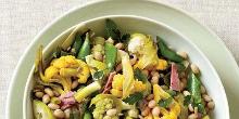 | Giardiniera with Ham and White Beans Recipe white bean, snap/snow peas, vegetables, olive oil, sunflower seeds, pepper, parsley, spring onion, cauliflower, ham, white wine vinegar, salt, sugar Grace Parisi quickly soaks baby cauliflower in vinegar and sugar, then combines it with snap peas, white beans, ham, and sunflower seeds. Set a resealable plastic bag in a bowl and add the vinegar, su...
