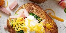 | Ham and Broccoli Topped Baked Potato Recipe | EatingWell potato, broccoli, ham, cheddar cheese, yogurt (plain) Jazz up your simple baked potato with a quickly microwaved topping. Instructions Checklist Step 1 In a small microwave-safe bowl, cook broccoli until just tender. Heat diced ham. Top potato with ham...