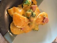 | Ham-Broccoli and Potato Bake Aka Ham and Broccoli Pie Recipe - Food.com butter, swiss cheese, mustard powder, potato, onion, broccoli, eggs, ham, salt, vegetable fat spread, milk, water From Betty Crocker's Hearty Meat & Potatoes, 1985. Family favorite...i usually served with applesauce and sliced tomatoes. Serving Size: 1 (333) g Servings Per Recipe: 6 AMT. PER SERVING % D...