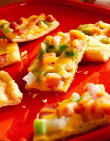| Ham-and-Cheese Crescent Snacks butter, onion, sweet pepper, ham, mustard, cheddar cheese, cheese, vegetable fat spread Refrigerated crescent rolls make for a quick crust for these savory appetizers. Preheat oven to 375 degree F. Unroll crescent roll dough onto an ungreased baking sheet. Pat or roll dough to a 13x9-inc...