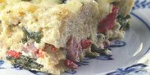 | Ham & Cheese Breakfast Casserole Recipe | EatingWell pork steak, egg whites, swiss cheese, red pepper, rosemary, pepper, spinach, eggs, mustard, cheese, bread, milk This healthy update of a traditionally rich ham-and-cheese breakfast strata is made lighter primarily by losing a few egg yolks and using nonfat milk. Gruyere cheese has a delicious, nutty aroma and f...