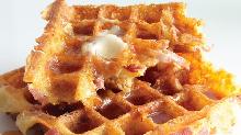 | Ham-and-Cheese Waffles Recipe | Bon Appetit butter, egg yolks, egg whites, bicarbonate of soda, oil, ham, salt, baking powder, cheddar cheese, maple syrup, sugar, sparkling water, buttermilk, flour This waffle recipe is a ham and cheese sandwich disguised as the greatest brunch dish of all time. Step 1 Preheat oven to 300 . Heat waffle iron until very hot. Whisk flour, sugar, baking powder, bak...