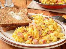 | Low-Fat Scrambled Eggs and Ham Recipe | CDKitchen.com butter, egg whites, egg substitute, ham, bread Scrambled eggs and ham doesn't have to be loaded up with fat and calories. Using egg whites, lean ham, and whole wheat toast turns a traditionally heavy breakfast into a much lighter one. Whisk to...