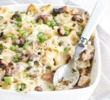 | Creamy ham & mushroom pasta bake recipe | BBC Good Food butter, mushrooms, spring onion, ham, cheddar cheese, milk, flour Use up the leftovers in your fridge with this hearty family supper dish, from BBC Good Food. STEP 1 Cook the pasta according to pack instructions, then drain. Heat oven to 200C/fan 180C/gas 6, then m...