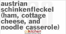 | Austrian Schinkenfleckel (Ham, Cottage Cheese, And Noodle Casserole) Recipe | CDKitchen.com cottage cheese, pepper, eggs, ham, worcestershire sauce, salt, noodles, parmesan cheese, sour cream A recipe for Austrian Schinkenfleckel (Ham, Cottage Cheese, And Noodle Casserole) made with egg noodles, ham, cottage cheese, sour cream, eggs, Worcestershire sauce, salt, black In a large mixing bowl...