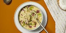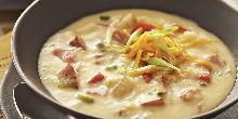 | Hearty Ham and Potato Soup Recipe | EatingWell butter, red potato, evaporated milk, red pepper, chicken stock, cornstarch, canola oil, sage, spring onion, garlic, sweet pepper, cauliflower, ham, cheddar cheese, vegetable fat spread, water Instructions Checklist Step 1 In a small microwave-safe bowl, combine cauliflower and the water. Cover with vented plastic wrap. Microwave on 100 percent power (high) 3 to 5 minutes or until caulifl...