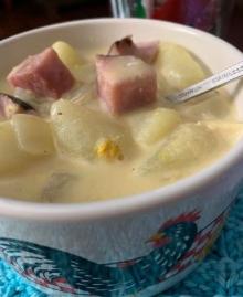 | Potato, Cheese and Ham Soup Recipe - Food.com butter, pepper, potato, onion, ham, salt, cheddar cheese, milk, water, flour Thick and creamy and full of nice big chunks of potato and ham. So easy and so comforting. Great way to use up that leftover ham after the holidays! Serving Size: 1 (550) g Servings Per Recipe: 4 AM...