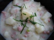 | Ham, Potato and Leek Soup Recipe butter, chicken stock, white peppercorn, parsley, dill, chives, potato, leek, ham, salt, cream Warm, creamy, filling soup with russet potatoes, fresh leeks, and chopped ham. Cook leeks in butter: Melt the butter in a large saucepan over medium heat. Add the leeks and cook, stirring occasionall...