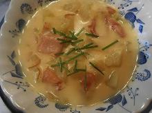 | Cheesy Creamy Ham and Potato Soup Recipe - Food.com butter, pepper, potato, onion, garlic, ham, salt, cheddar cheese, milk, water, flour A rich hearty soup great for left over holiday ham. I use the bone from the ham to make the stock. DS said it was the best soup he ever had! Serving Size: 1 (383) g Servings Per Recipe: 6 AMT. PER S...