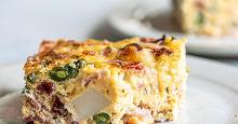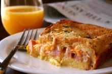 | Ham & Cheese Breakfast Casserole Recipe | EatingWell pork steak, egg whites, swiss cheese, red pepper, rosemary, pepper, spinach, eggs, mustard, cheese, bread, milk This healthy update of a traditionally rich ham-and-cheese breakfast strata is made lighter primarily by losing a few egg yolks and using nonfat milk. Gruyere cheese has a delicious, nutty aroma and f...