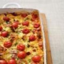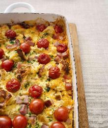 | Tomato and Ham Breakfast Casserole Recipe | Real Simple heavy cream, pepper, parsley, tomato, eggs, ham, salt, cheddar cheese, bread Get the recipe for Tomato and Ham Breakfast Casserole. Instructions Checklist Step 1 Heat oven to 375 F. In a large bowl, whisk together the eggs, cream, 1 teaspoon salt, and 1 teaspoon pepper. Add ...