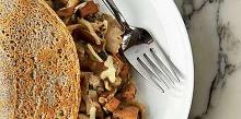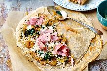 | Ham and cheese buckwheat crepes with cider onions - Recipes - delicious.com.au butter, buckwheat flour, sunflower oil, thyme, onion, spinach, eggs, ham, cheese, apple cider, milk, flour Delicate buckwheat crepes are just the vehicle for thinly sliced ham, Gruyere and sweet, sticky onions slow cooked in cider. 1. Place both flours, eggs and milk in a large bowl and whisk until smooth...
