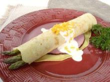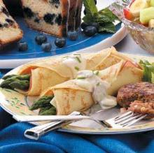 | Asparagus and Ham Crepe Recipe - RecipeTips.com butter, asparagus, eggs, ham, salt, milk, flour When rolled with thinly sliced ham in a delicate crepe, tender asparagus becomes a tasty dish for a brunch or light lunch. PREP 45 mins READY IN 1 hr Slice 12 pieces of ham. Wash and trim 12-14 s...