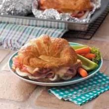 | Hot Ham-and-Cheese Croissant Recipe | Martha Stewart swiss cheese, croissant, ham, mustard, mayonnaise, cheese Enjoy breakfast on-the-go with this delicious crisp ham and cheese croissant sandwich that uses leftover Easter ham. Instructions Checklist Step 1 Preheat oven to 375 degrees. Cut a pocket in the cr...