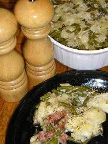 | Mantua Sunday Dinner Greens Beans Ham And Potatoes Recipe chicken stock, pepper, dried onion, dried garlic, potato, onion, green beans, ham, seasoning I make this dish often; I have never really measured the ingredients, Halve beans if they are large, place in a slow cooker with water to barely cover, and add onion and ham hocks... Cover, and cook...
