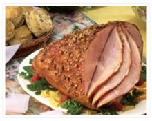 | Glazed Ham with Pecan Crust pecan, ham, mustard, brown sugar, apple cider Glazed Ham with Pecan Crust, a traditional ham meets Southern inspiration with this Pecan crust. Preheat oven to 325 degrees F. Insert meat thermometer into center of ham without touching bone. Plac...