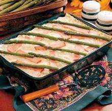 | Asparagus Ham Lasagna Recipe: How to Make It butter, thyme, pepper, garlic, asparagus, ham, mozzarella cheese, pasta, milk, flour Our family had an asparagus farm during the Depression. My brother and I picked and sorted spears after school and on weekends...and, needless to say, we ate this vegetable quite often. This is one of...