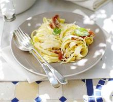 | Creamy linguine with ham, lemon & basil recipe | BBC Good Food egg yolks, dry cured ham, olive oil, basil, lemon, parmesan cheese, pasta, creme freche Keep the kids happy with this easy, low-fat recipe that's ready in under half an hour, form BBC Good Food magazine. STEP 1 Cook the linguine. Meanwhile, tear the ham into small pieces and fry in ...