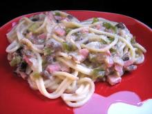 | Creamy Linguine With Ham Recipe - Food.com red pepper, chicken stock, zucchini/courgette, ham, mayonnaise, parmesan cheese, pasta Found in a spiral notebook. no idea on source. Serving Size: 1 (141) g Servings Per Recipe: 4 AMT. PER SERVING % DAILY VALUE Calories: 318.1 Calories from Fat 74 g 23 % Total Fat 8.3 g 12 % Satu...