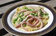 | Linguine With Ham and Cheese Sauce Recipe - Food.com butter, swiss cheese, pepper, peas, onion, garlic, ham, salt, pasta, milk, flour This is a good recipe for kids...young ones seem to like it. :) I tell them the peas are balls! Not bad for adults either....nothing like ham and swiss. Serving Size: 1 (219) g Servings Per Recipe: 6...