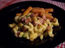 Ham and Peas Mac and Cheese Recipe - Food.com butter, swiss cheese, pepper, paprika, dried garlic, peas, onion, ham, mustard, salt, cheddar cheese, pasta, milk, flour An all-in-one stovetop meal that tastes good and rhymes, too ;) Serving Size: 1 (341) g Servings Per Recipe: 8 AMT. PER SERVING % DAILY VALUE Calories: 838.3 Calories from Fat 406 g 48 % Total Fa...