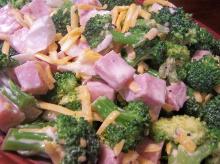 | Broccoli Salad With Ham Recipe - Food.com pepper, onion, broccoli, ham, cheddar cheese, whipped topping, lemon juice Our favorite broccoli salad. Serving Size: 1 (181) g Servings Per Recipe: 6 AMT. PER SERVING % DAILY VALUE Calories: 168.6 Calories from Fat 94 g 56 % Total Fat 10.5 g 16 % Saturated Fat 5.4 g 2...