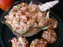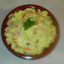 | Ham Salad Recipe red pepper, pepper, parsley, potato, eggs, ham, salt, mayonnaise A tasty salad consistant for winter..... Boil the potatoes and the eggs.Dry,chill well. Then,cube them.In a bowl,mix ham cubes,chopped red pepper ,chopped pickles,potatoes,eggs,salt,pepper,parsley.Pu...