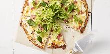 | Ham 'N' Cheese Salad Pizza - GoodHousekeeping.com frisee, fontina cheese, pizza bread, ricotta cheese, pepper, basil, garlic, ham, salt, lemon juice Try a fun twist on pizza with this Ham 'N' Cheese Salad Pizza Recipe from GoodHousekeeping.com. Step 1 Spray a large cookie sheet with nonstick spray. Mix ricotta, garlic, salt and pepper; spr...