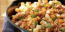 Sweet Potato and Canadian Bacon Hash Recipe | MyRecipes red potato, canadian bacon, green bell pepper, chicken stock, oil, pepper, nutmeg, celery seed, sweet potato, spring onion, apple cider vinegar, salt Sweet potatoes are a creamy addition to this breakfast classic. To avoid mushy hash, don't boil the potatoes too long; remove them from the water while they're still al dente. Instructions Che...