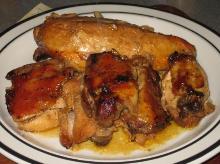| Easy Crock Pot Teriyaki Chicken Recipe - Food.com chicken thigh, ginger root, garlic, soy sauce, brown sugar Serving Size: 1 (105) g Servings Per Recipe: 3 AMT. PER SERVING % DAILY VALUE Calories: 161.2 Calories from Fat 29 g 18 % Total Fat 3.3 g 5 % Saturated Fat 0.8 g 4 % Cholesterol 68.1 mg 22 % S...