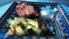 | Peanut-Ginger Chicken With Fresh Fruit Salsa Recipe - Food.com chicken thigh, hot sauce, oil, red peppercorn, ginger root, dried ginger, plum, nectarine, peach, pear, spring onion, garlic, cucumber, fruit, peanut butter, vinegar, soy sauce, sugar, water We made this last summer for a barbeque and everybody loved it. I used a nectarine and pear combination for the salsa and added about 1/2 teaspoon crushed red pepper for bit of a kick. YUM! Cooking ti...