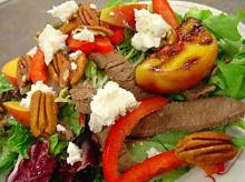 Steak Salad With Grilled Peaches Recipe - Food.com beef flank steak, italian dressing, red pepper, spring greens, goat's cheese, olive oil, canola oil, pecan, pepper, lime, lemon, peach, shallot, lettuce, white wine vinegar, salt, sugar, orange juice Grilling fruit really brings out the natural sugars in them and they take on a whole new dimension. Don't use canned or very ripe peaches for this recipe or you will have a big mess on your grill....