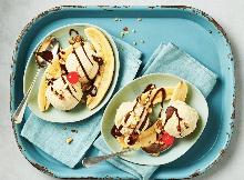 | Banana Split Sundae Recipe | EatingWell peanut, banana, maraschino cherry, peanut butter, whipped topping, chocolate syrup Homemade banana and peanut butter ice cream topped with chocolate syrup and peanuts make this sundae a dessert favorite. Instructions Checklist Step 1 In a food processor combine bananas and peanut ...