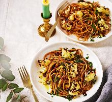 | Cauliflower and Caramelised Onion Pasta Recipe with Pine Nuts | olivemagazine olive oil, pine nut, parsley, raisin, onion, cauliflower, sherry vinegar, pasta Roast cauliflower, juicy raisins and slow-cooked caramelised onions come together to create this easy vegan pasta dish, ready in 40 minutes! STEP 1 Heat half of the olive oil in a frying pan over a l...