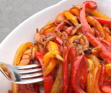 | Caramelized Onions and Bell Peppers bell pepper, olive oil, thyme, pepper, onion, balsamic vinegar, salt TESTED & PERFECTED RECIPE – Onions and bell peppers transformed into sweet caramel-colored ribbons. Delicious with steak or spicy Italian sausage. Heat the oil in a large skillet over medium...